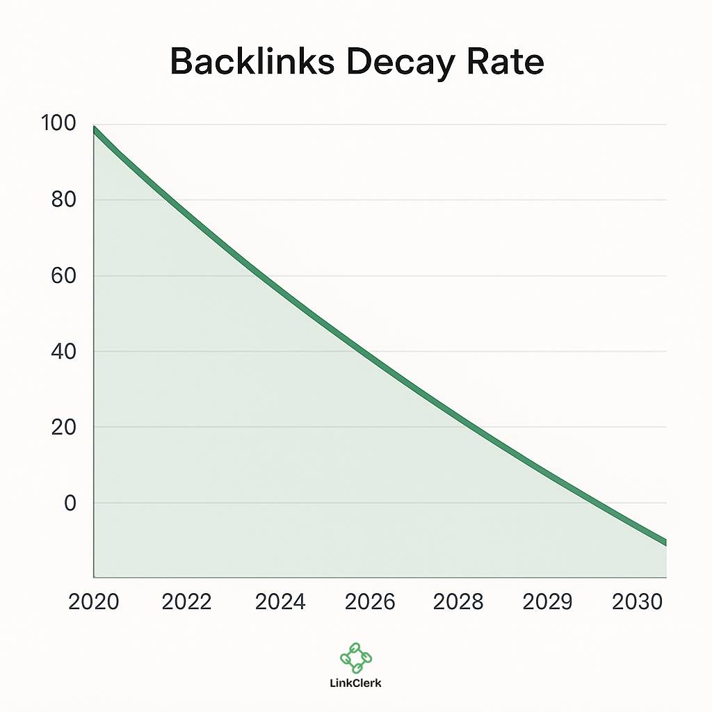 While long‑term studies show dramatic cumulative decay, the annual rate is more manageable. Most SEO practitioners and tool providers report that 8–15% of backlinks lose value each year, either through removal, redirect dilution or declining authority of the linking page.