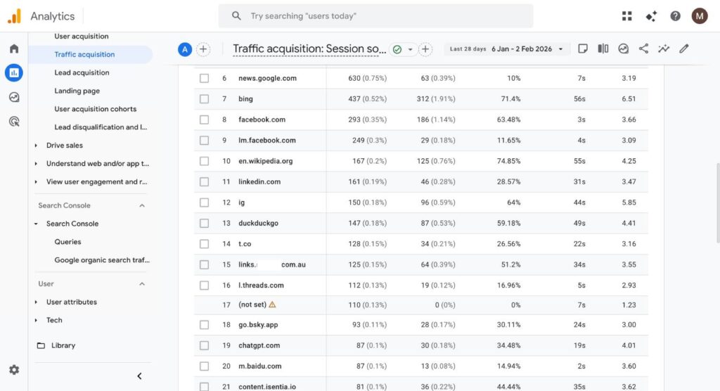 In reality, the Referral report is a goldmine. It reveals every external site that sends visitors to your pages, including links that Search Console has not yet processed. This makes Analytics especially useful for catching new backlinks early.